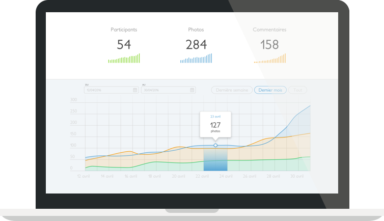 Grâce à l'interface de modération de Families Business, vous disposez en live d'une interface de statistiques. Vous pouvez facilement suivre l'historique de vos événements et analyser le comportement des ajouts de photos ou de commentaires.